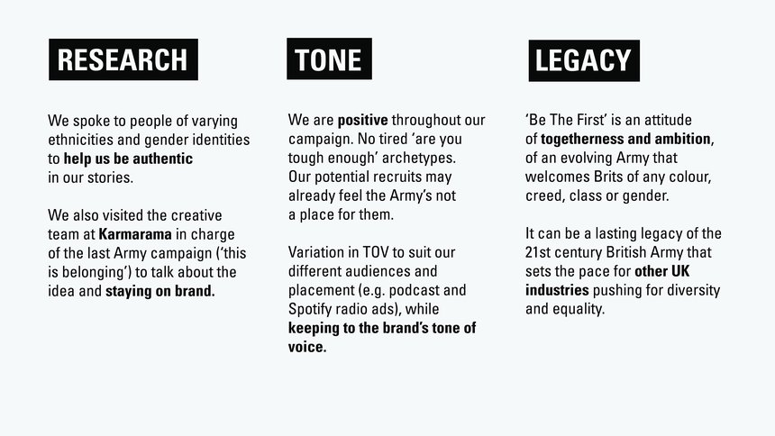 Be The First is a campaign of togetherness and ambition with mentorship and a see it to be it mentality at its core. To attract diversity through ages 16 to 35, we need to show it already exists - and thrives - in our ranks. It's a call to arms to become part of an evolving Army that welcomes Brits of any colour, creed, class or gender. An extension of the brand, Be The First could leave a legacy for the British Army that sets the tone for other UK industries pushing for diversity and equality.